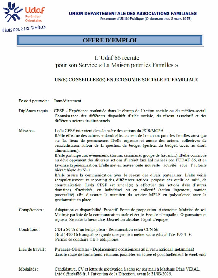 📩 Envoyez votre CV et lettre de motivation avant le 31 mars 2026 à : i.vidal@udaf66.fr (à l’attention de la Direction)